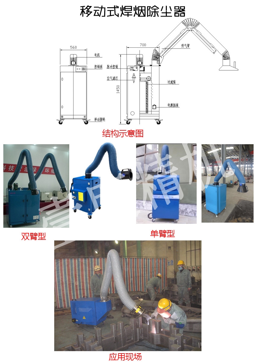 工作原理:焊接工作中產生的煙塵由吸氣罩吸入煙塵凈化器中,首先通過凈化器的第一層阻火網,可對大顆粒狀及打磨產生的火星顆粒進行分離截留,初步過濾的空氣再進入第二層濾芯防護板,防護板對其進行分流及避免殘留火星直接進入主過濾芯;分流后的含塵氣體再進入第三層主過濾芯進行終極凈化,主過濾芯的過濾效果高達99.9%,由于主過濾芯的高效過濾精度可達到室內排放標準,過濾后的干凈空氣通過凈化器下方排風口直接排到室內循環。移動式焊接煙塵凈化器可配置兩根或單根吸氣臂,底部配有定向和萬向帶剎車裝置的聚氨脂腳輪,用于移動焊接工位。吸氣臂可360度自由旋停,通過拉動吸氣罩上的手柄,可靈活輕松隨操作者的意愿到達目的位置點及煙塵吸氣角度,并在無外力作用下自行空中定位;可選配2m,3m柔性吸氣臂;吸氣軟管采用真正的耐溫、阻燃、耐磨復合材料,不會因火星穿后開裂,使用壽命更長;臂管直徑為160mm.